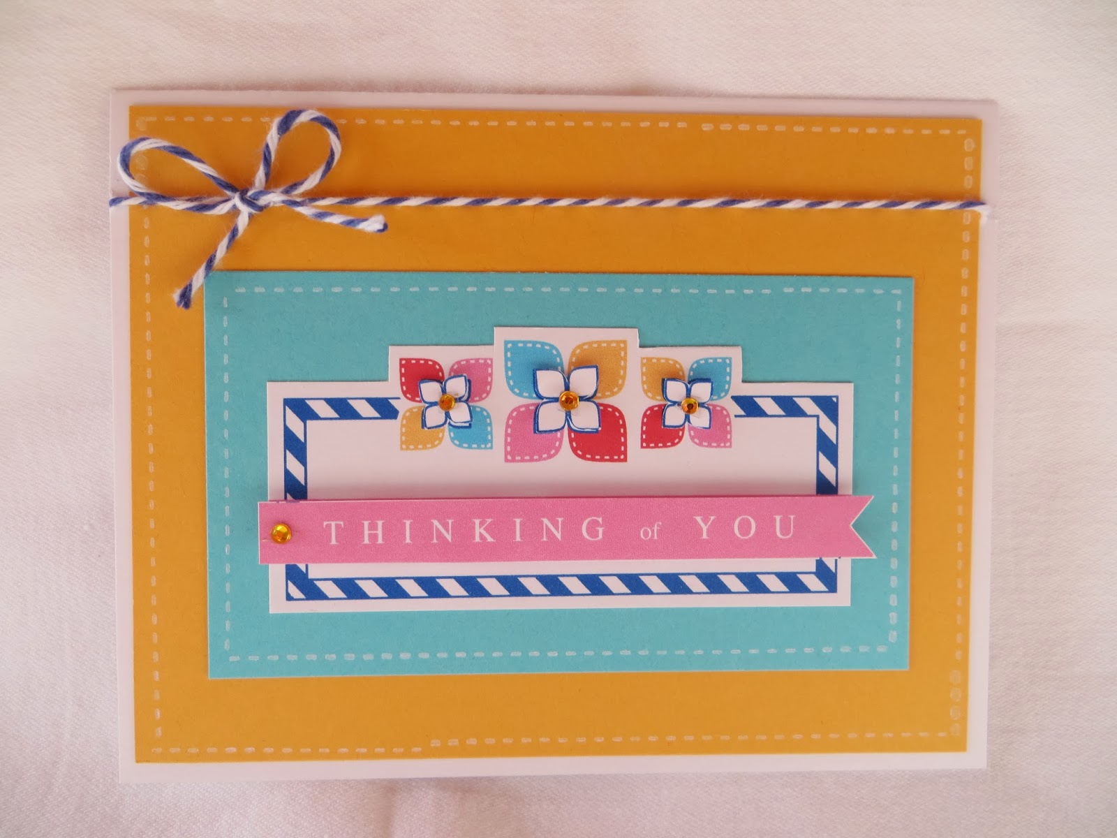I used PTI "sew simple borders" around the matting cards to replicate the stitching on the "flowers", popped the sentiment and the inside flowers up to give some dimension and added a simple bow with bakers twine.